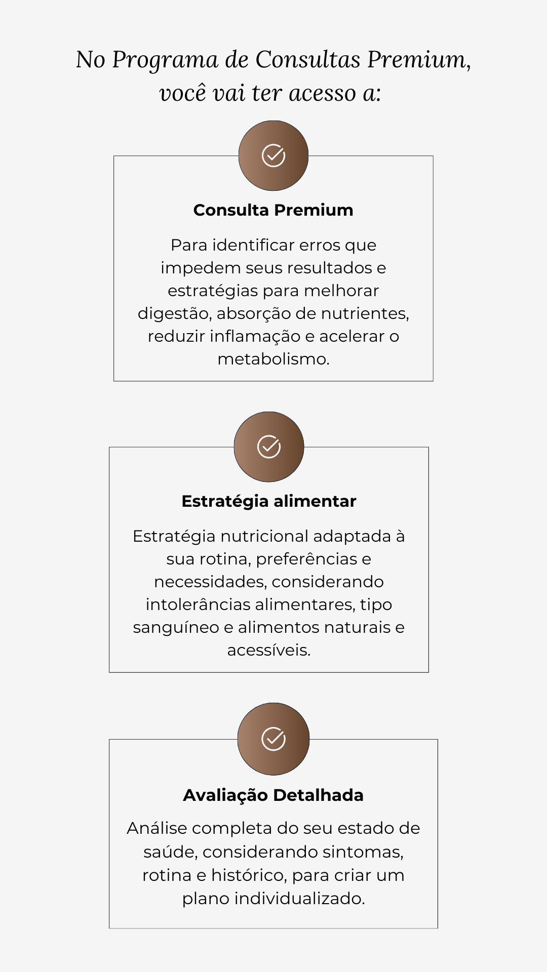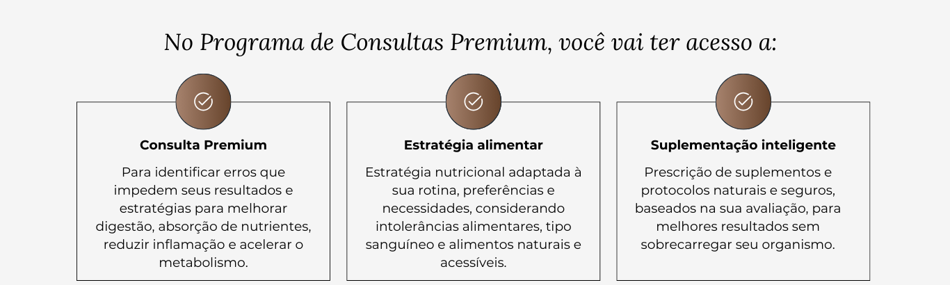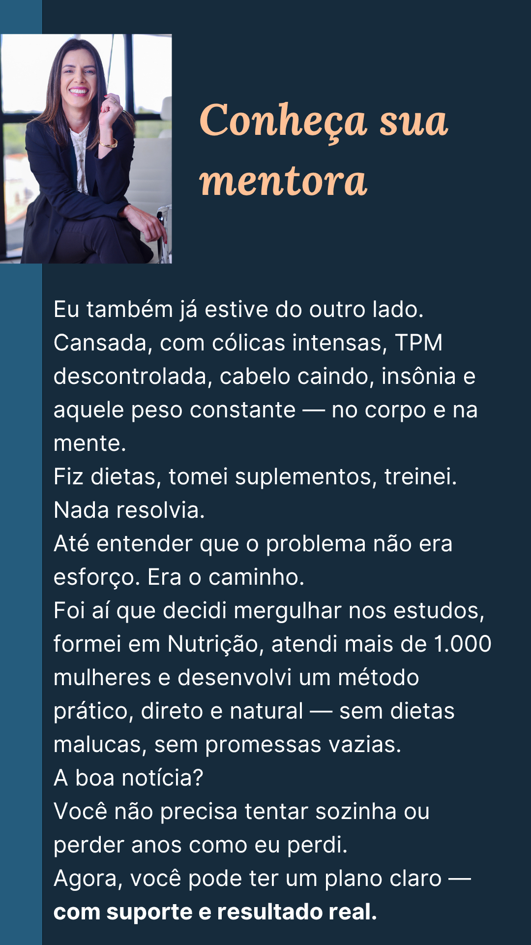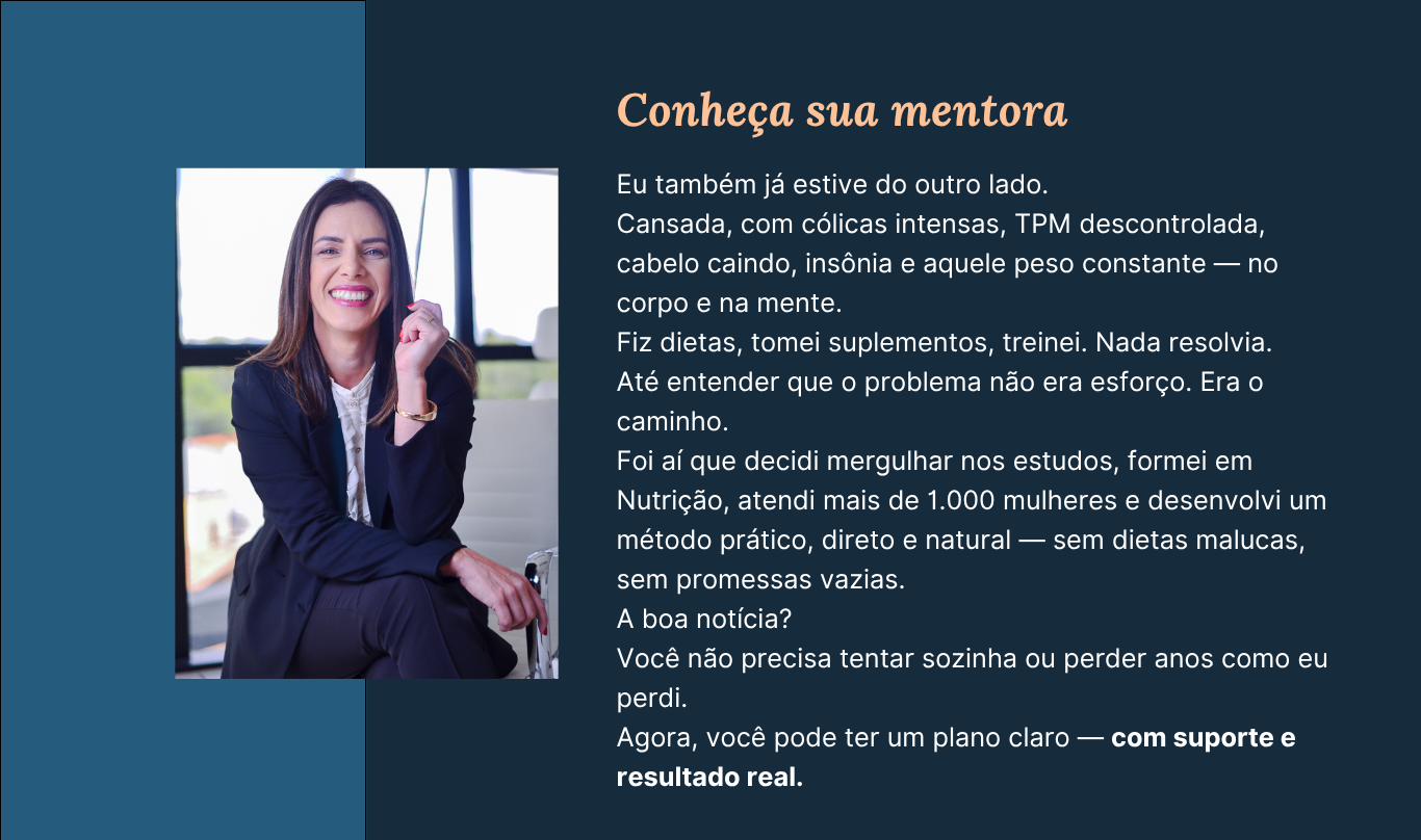 Você já gastou muito mais com suplementos aleatórios, consultas de 15 minutos e dietas que só te deixaram frustrada. Aqui, o caminho é diferente — com ciência, constância e suporte de verdade.