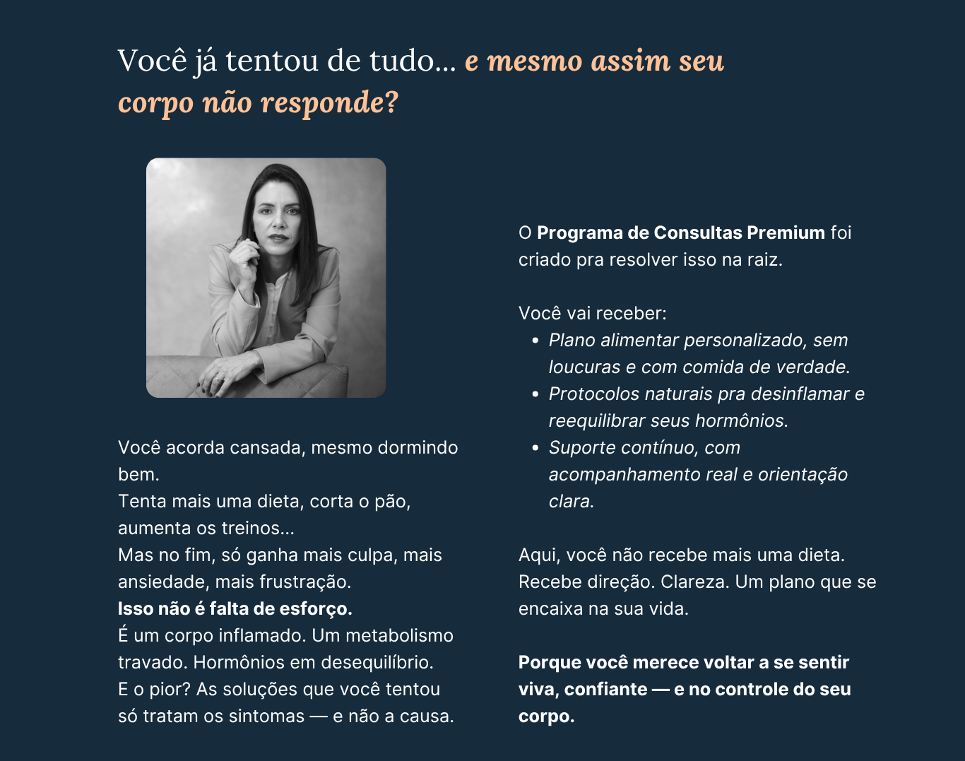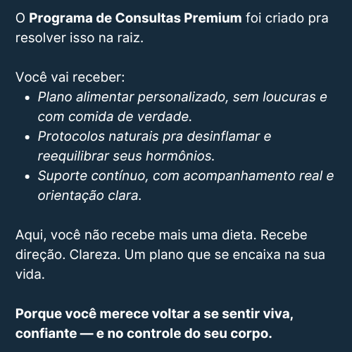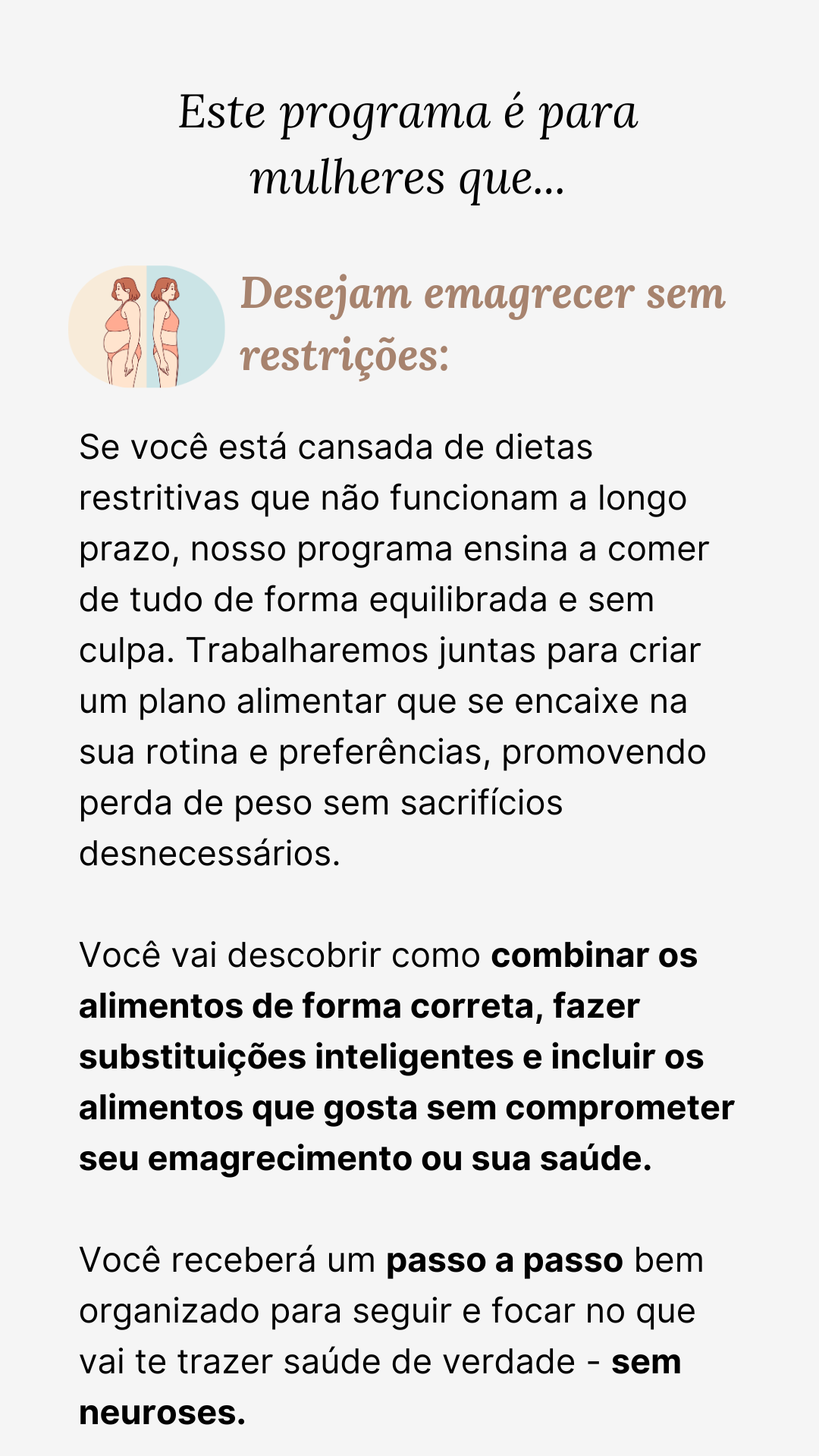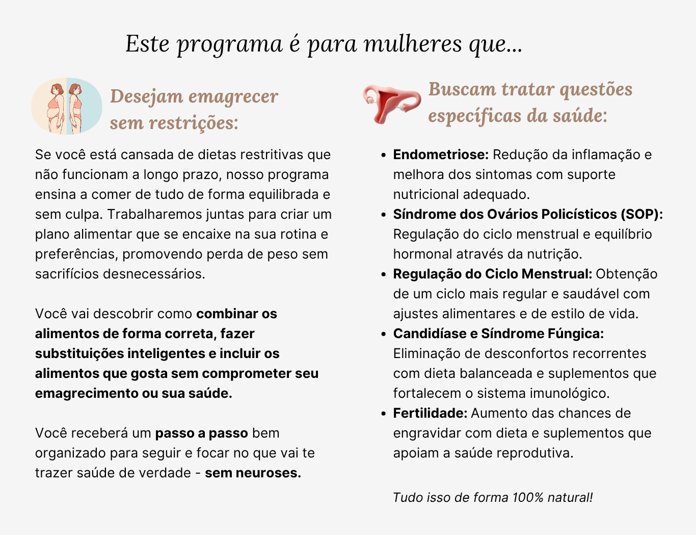 Esse programa é exclusivo para mulheres que não aceitam mais viver cansadas, inchadas e sem resultado. Não é pra quem procura soluções mágicas em 30 dias, mas sim para quem está pronta para transformar de dentro pra fora, com clareza e direção.