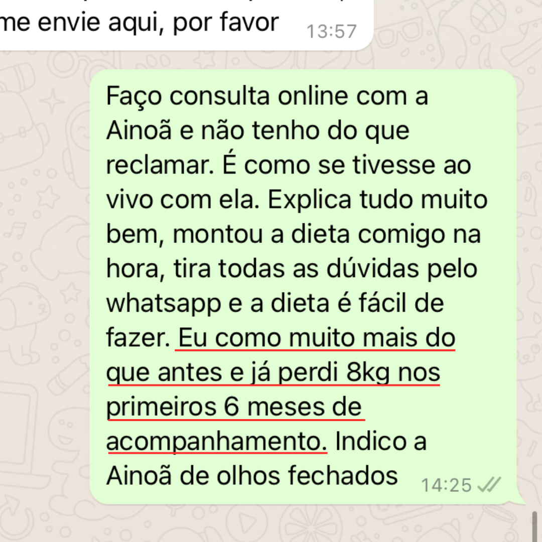 As duas opções estão disponíveis. Se você está em Brasília, pode escolher o atendimento presencial. Se está em outra cidade ou país, o acompanhamento online funciona com a mesma eficiência — com encontros mensais por vídeo, planos alimentares atualizados e suporte contínuo pelo WhatsApp.