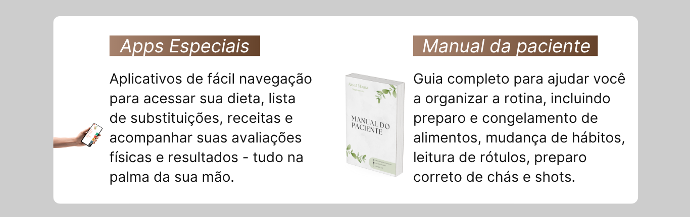 Se você escolher um plano de 3 ou 6 meses, teremos encontros mensais (online ou presencial) e acompanhamento diário por WhatsApp. A cada consulta, você recebe plano alimentar, protocolos de suplementação inteligente, estratégias de evolução, materiais exclusivos e acesso à nossa comunidade exclusiva para pacientes.