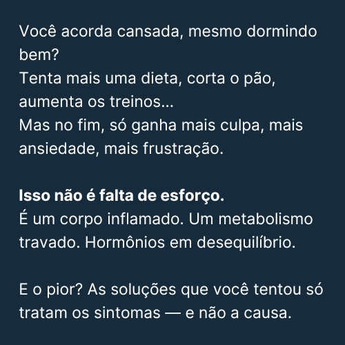 Você não precisa de mais um check-up vazio ou uma dieta genérica de 15 minutos de atenção. Aqui, o foco é outro: tratar a raiz, enxergar além dos sintomas e construir um corpo que funcione do jeito que deveria.