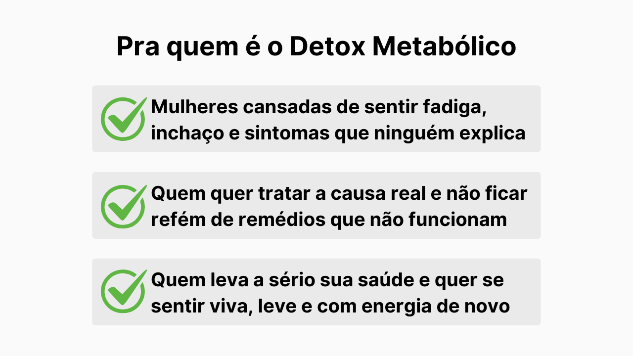 O Detox Metabólico é um atalho direto e funcional: em apenas 14 dias, você elimina toxinas, reduz sintomas e recupera sua energia, leveza e clareza mental — sem sofrimento e sem enrolação.