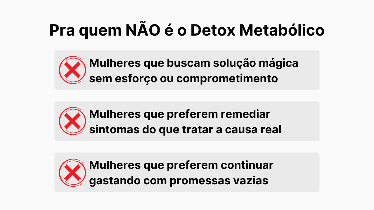 Não. O Detox Metabólico não é indicado para gestantes ou lactantes. Nesses casos, o ideal é ter o acompanhamento individualizado de um nutricionista. Esse protocolo é exclusivo para mulheres que não estejam grávidas, nem amamentando, e que não apresentem condições clínicas específicas ou patologias.