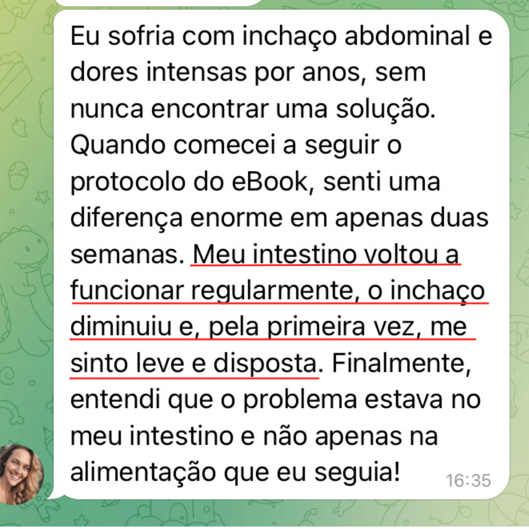 A Grazi vivia com inchaço e dores abdominais. Ela seguiu o Protocolo e o intestino voltou a funcionar e hoje ela se ente mais leve e disposta.